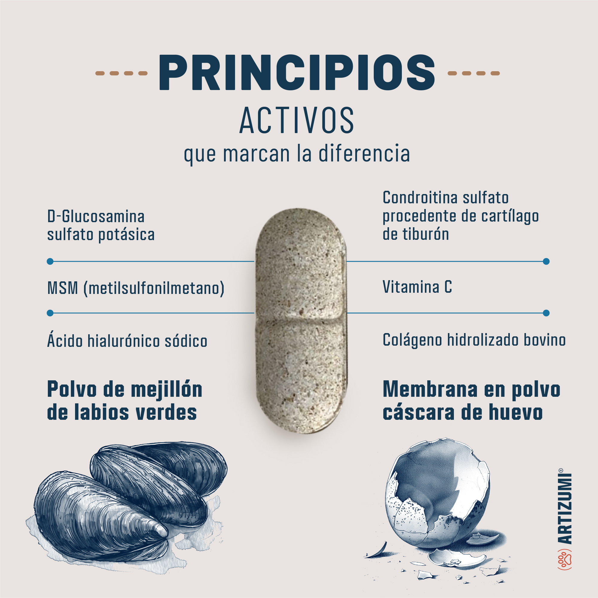 Artizumi combina componentes como la glucosamina o la condroitina para proteger y reforzar las articulaciones de tu perro.